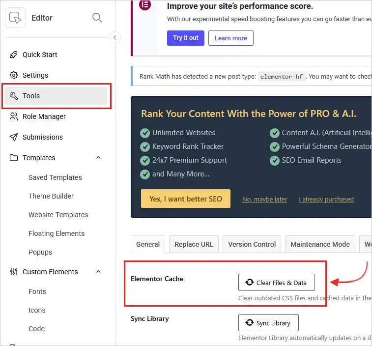 The Tools section contains maintenance options that help resolve Elementor issues.