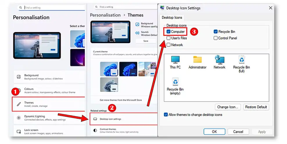 Right-click on the desktop → Click Personalize → Go to Themes → Click Desktop icon settings → Check Computer (This PC) → Click Apply.